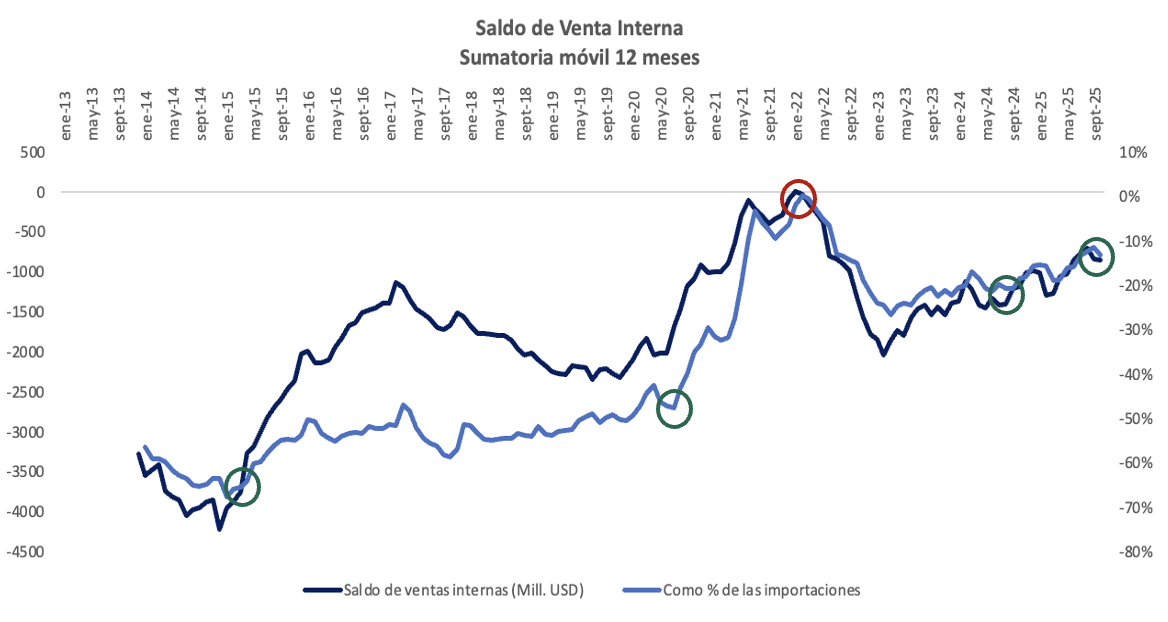 Finalmente, el saldo observado entre ingresos y gastos muestra un esfuerzo sostenido para reducir el subsidio a los combustibles. Pasando de valores cercanos a los USD -3.800 millones en 2014 (65% del costo de importación) a cerca de USD -850 millones en 2025 (15% del costo de importación). Dentro del periodo analizado se logra diferenciar los siguientes momentos fiscales: